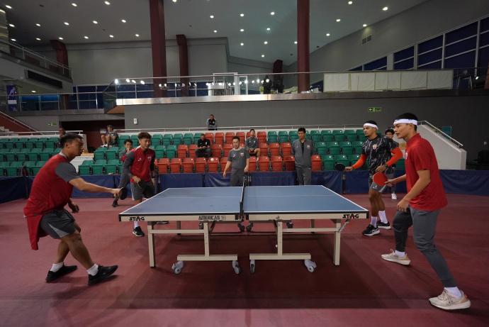 教练组暂停高强度训练,在前一天组织了一场趣味乒乓球交流赛,既保障一定的训练量,也通过游戏方式给球员们进行心理放松。从赛前抽签、裁判执法到宣布最终结果,这场海港队内的乒乓球交流赛,充满了欢声笑语。刘若钒通过社交媒体透露,他和后卫蒋光太搭档最终获得亚军,冠军选手组合中有一名尚未官宣的内援,因此并未对外公布比赛成绩。